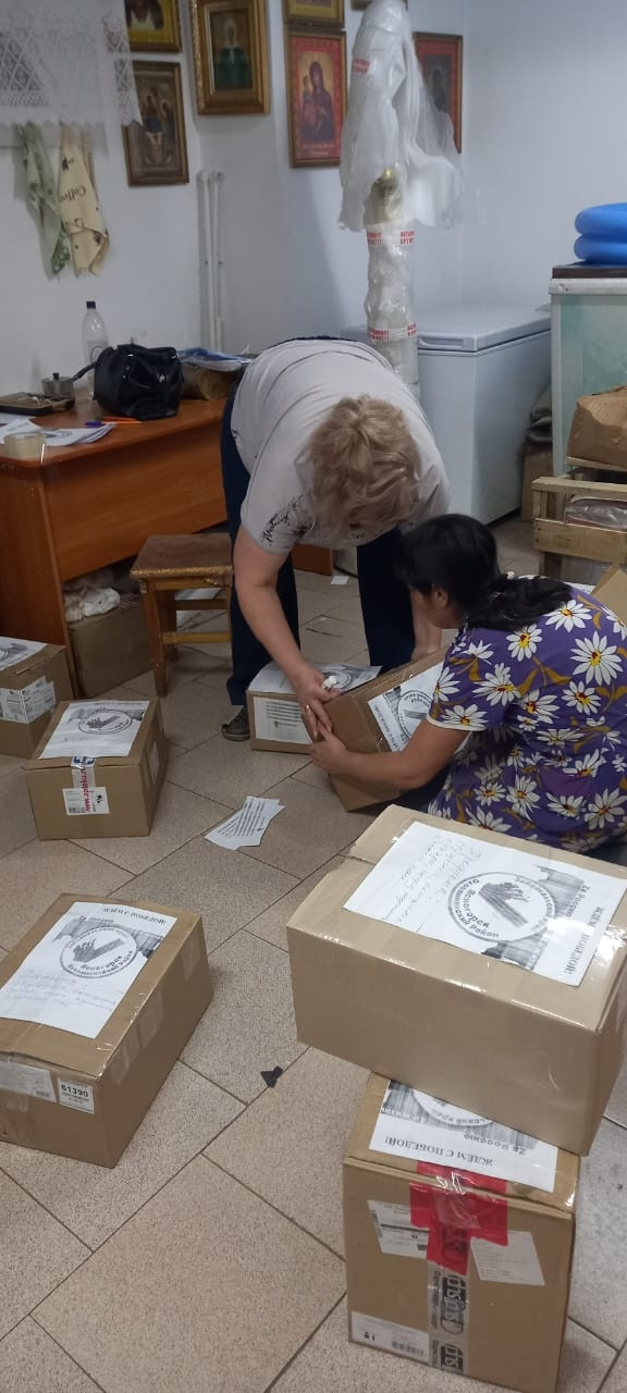 В каждой коробке вложены письма прихожан с маленькими иконами,кто-то принес карманные молитвословы.